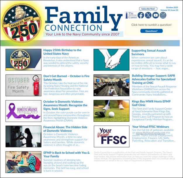 Family Connection Newsletter (FCN) is a publication of the Fleet and Family Support Program. The Family Connection Newsletter (FCN) is published the first of every month and is used as a monthly information publication for Commander Navy Installations Command’s (CNIC) Sailors and families to promote the self-reliance and resilience. The FCN provides information, articles, webinar class schedules, and much more. The FCN is published to help Navy Sailors and families meet the unique challenges of the military lifestyle. We hope you enjoy! CURRENT EDITION FCN October 2025 PAST EDITIONS FCN September 2025 FCN August 2025 FCN - July 2025 FCN - June 2025 FCN - May 2025 FCN - April 2025 FCN - March 2025 The appearance of external links in this newsletter does not constitute an official endorsement on behalf of the U.S. Navy or the Department of Defense. If you have questions or comments, contact the Fleet and Family Support Program, cnichq-ffsp@us.navy.mil.
