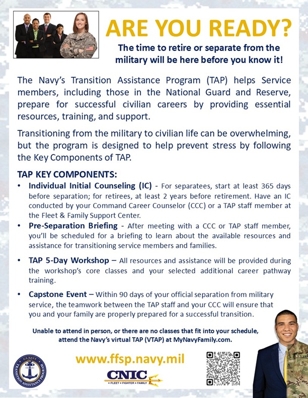 - The Navy Transition Assistance Program is designed to provide the most successful transition from military to civilian life by offering in-person and virtual classes. For in-person workshops, contact your local Fleet and Family Support Center. For virtual workshops, access mynavyfamily.com.