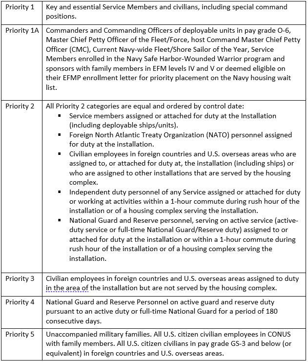All applicants fit into a priority; this prioritization is in place to ensure priority to military members and provide those with the greatest need for military housing a reasonable timeframe for obtaining it.