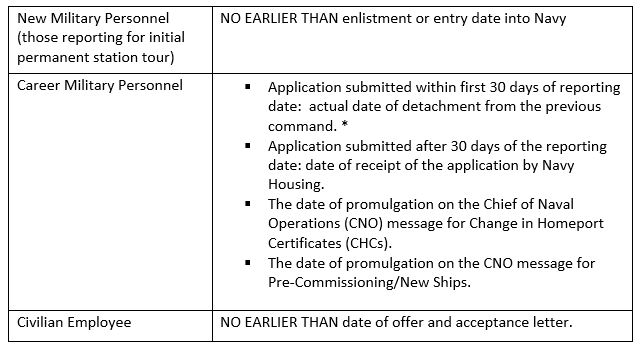 Once the required documents have been submitted, you will be placed in a queue for housing until you are within 30-45 days of your arrival. For planning purposes, Navy Housing (for Navy-owned) and our Partners (for privatized) do not typically reserve homes for greater than 30 days. Your local Navy HSC can tell you when they begin assigning homes, as this may vary by installation.