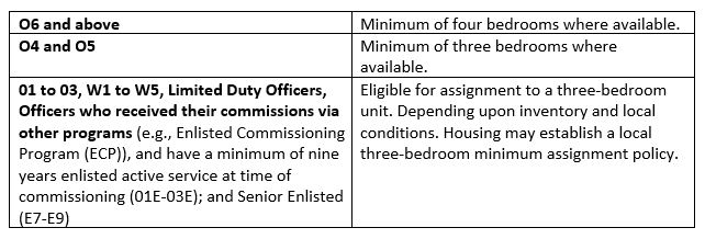 Navy Housing has set minimum bedroom standards for the home based on both pay grade and family size/composition. This is dependent upon inventory availability at a local installation. Minimum standards based on pay grade are: