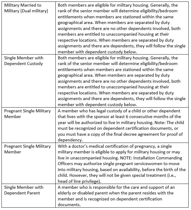 Generally, the following personnel are eligible for family housing: