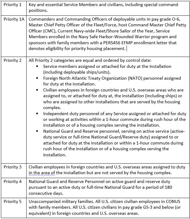 All applicants fit into a priority; this prioritization is in place to ensure priority to military members and provide those with the greatest need for military housing a reasonable timeframe for obtaining it.