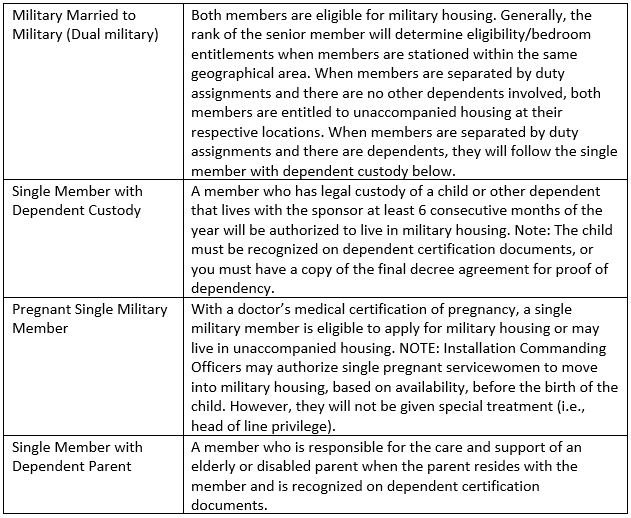 On Permanent Change of Station (PCS) orders or Duty Under Instruction (DUINS), eligibility does not ensure availability of or assignment to military housing. Other personnel may be eligible for military housing including unaccompanied or pregnant military members, Coast Guard, etc., based on military housing availability and other local conditions.