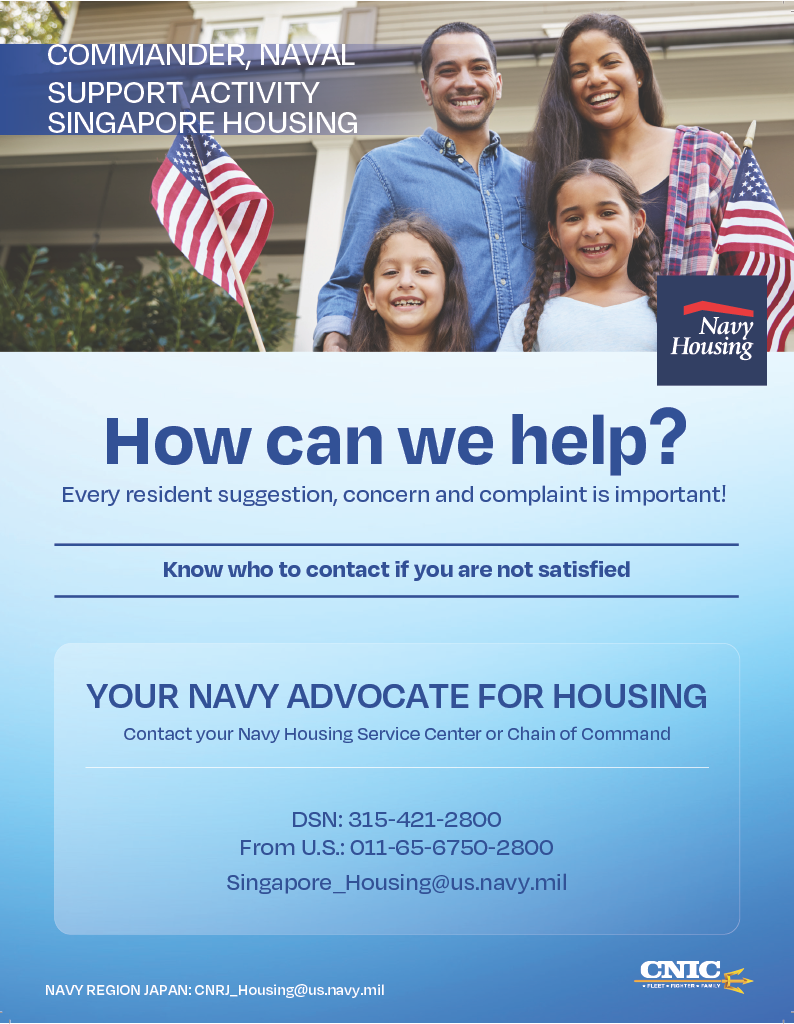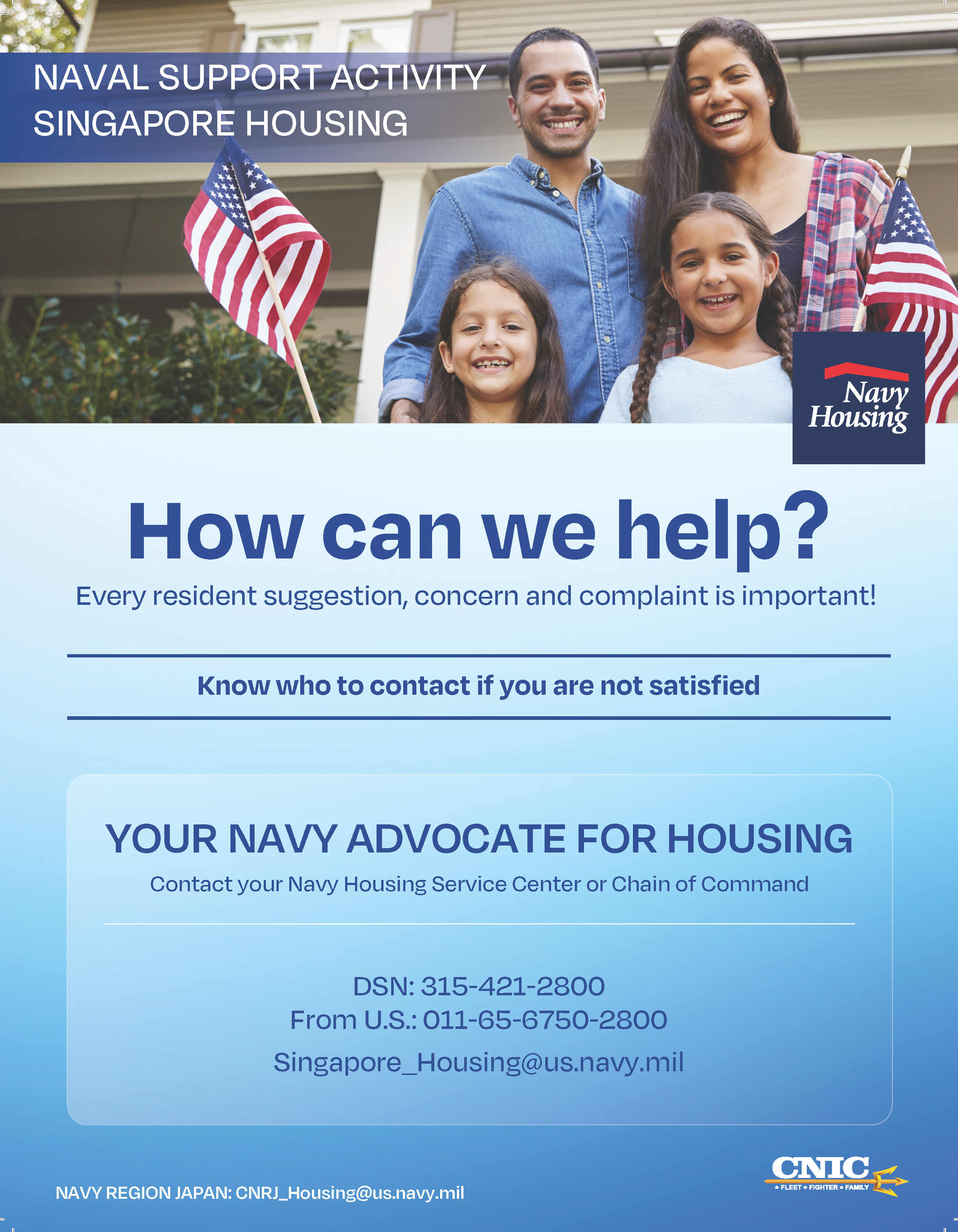 There is one family housing neighborhood located aboard NSA Singapore. If appropriate quarters are not available upon arrival, personnel will be placed on a waiting list. When a unit becomes available, the Service Member and family will receive a government-funded move from their off-base residence to family housing on base. Contact the HSC to get the most current projection of housing availability and wait list information.