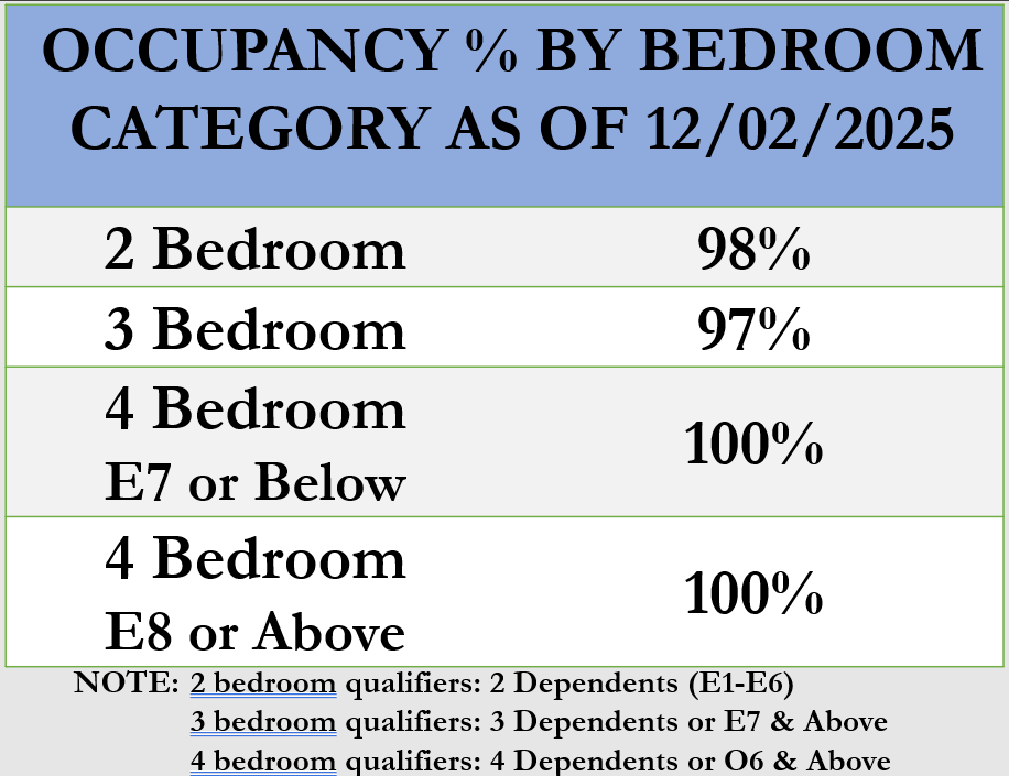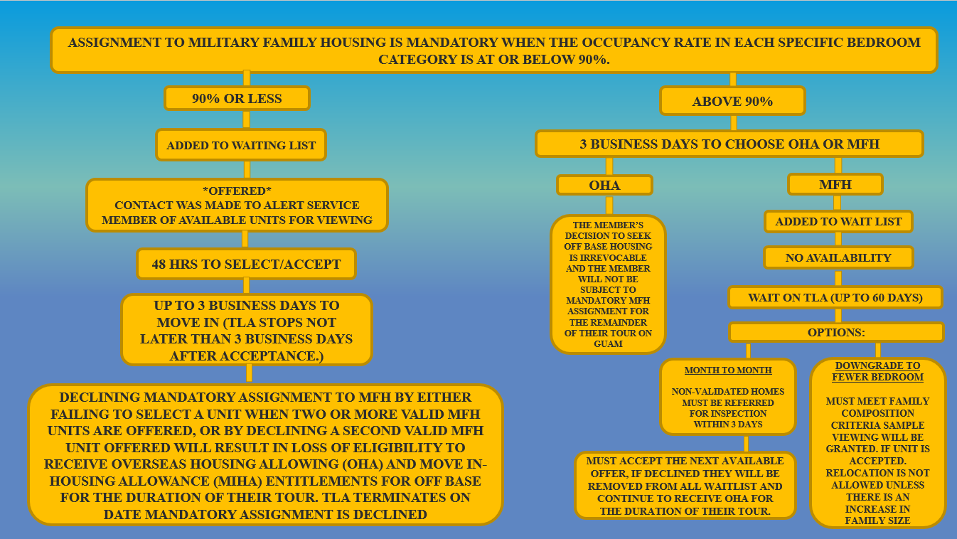 If appropriate quarters are not available upon arrival, personnel will be placed on a waiting list. When a unit becomes available, the Service Member and family will receive a government-funded move from their off-base residence to family housing on base. Contact the HSC to get the most current projection of housing availability and wait list information.