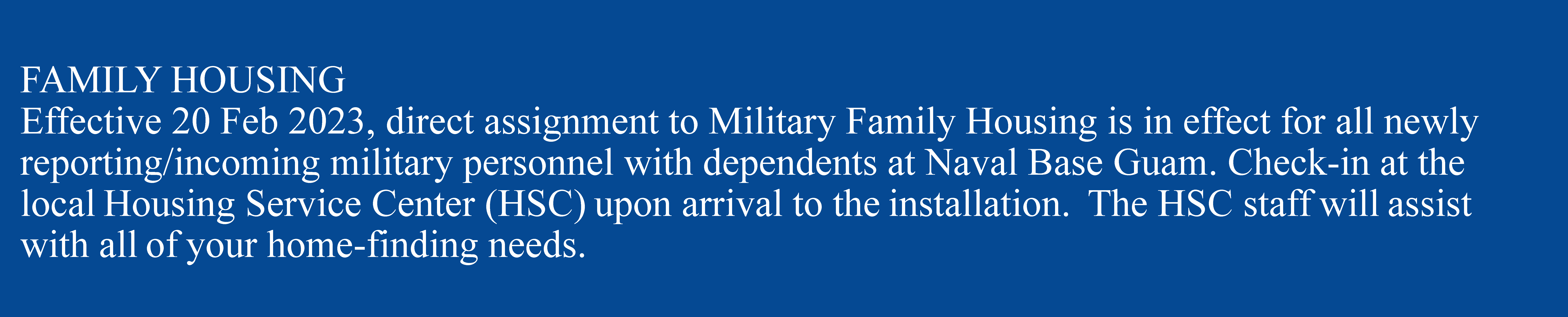 Accompanied personnel reporting to NAVBASE Guam have the option to reside in government-owned family housing or in the local community. Check-in at the local Housing Service Center (HSC) during arrival to the installation. The HSC staff will assist with all of your home-finding needs. Within 3 business days of arrival, check-in to the NAVBASE Guam HSC to sign up for the Housing Welcome Brief, mandatory attendance is required please contact the HSC for more information.