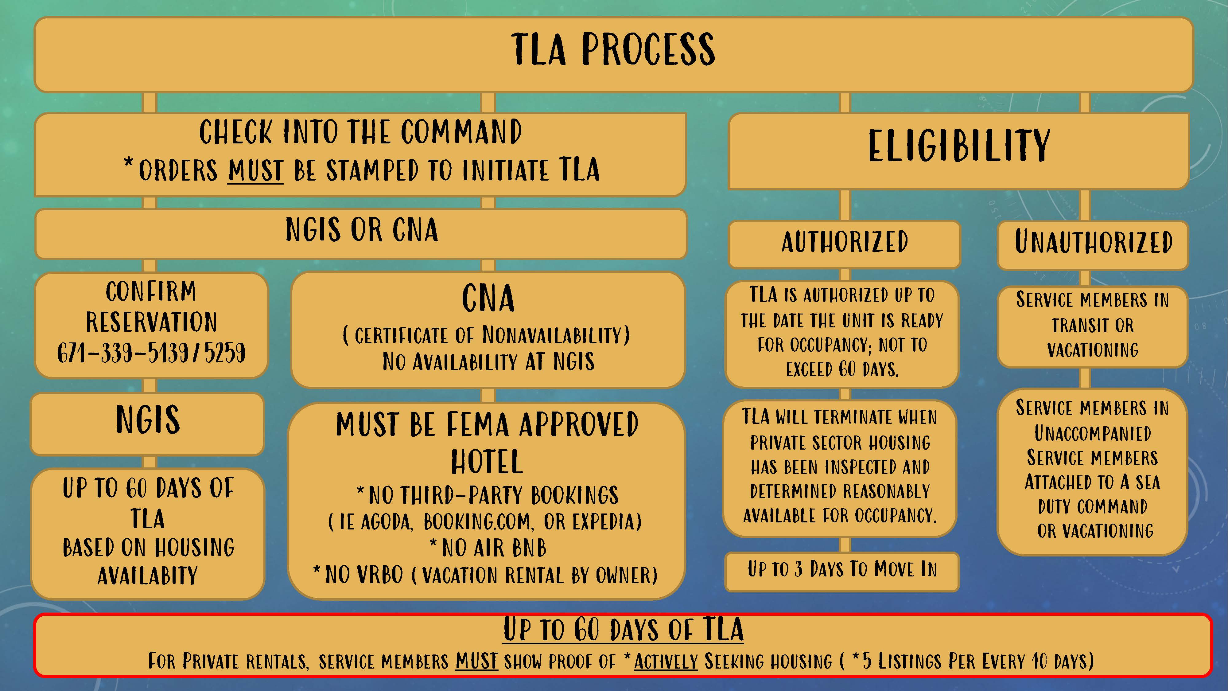 TLA must be submitted to the Housing Service Center (HSC) every 10 days by providing all required documents, commencing form the date of command check-in. TLA will be paid as a reimbursement and not processed in advance.