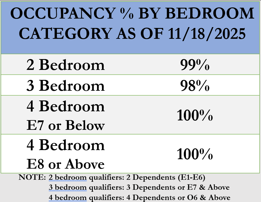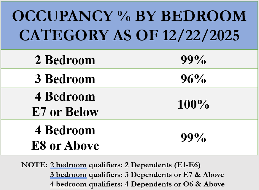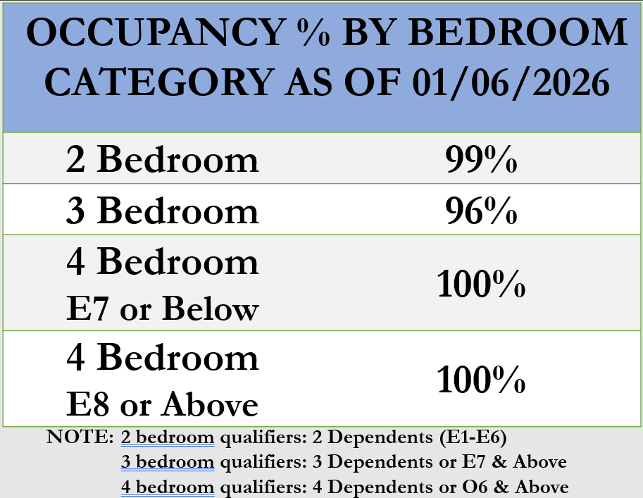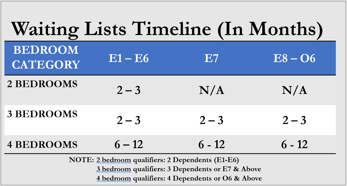 If appropriate quarters are not available upon arrival, personnel will be placed on a waiting list. When a unit becomes available, the Service Member and family will receive a government-funded move from their off-base residence to family housing on base. Contact the HSC to get the most current projection of housing availability and wait list information.