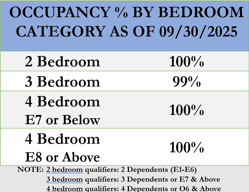 If appropriate quarters are not available upon arrival, personnel will be placed on a waiting list. When a unit becomes available, the Service Member and family will receive a government-funded move from their off-base residence to family housing on base. Contact the HSC to get the most current projection of housing availability and wait list information.