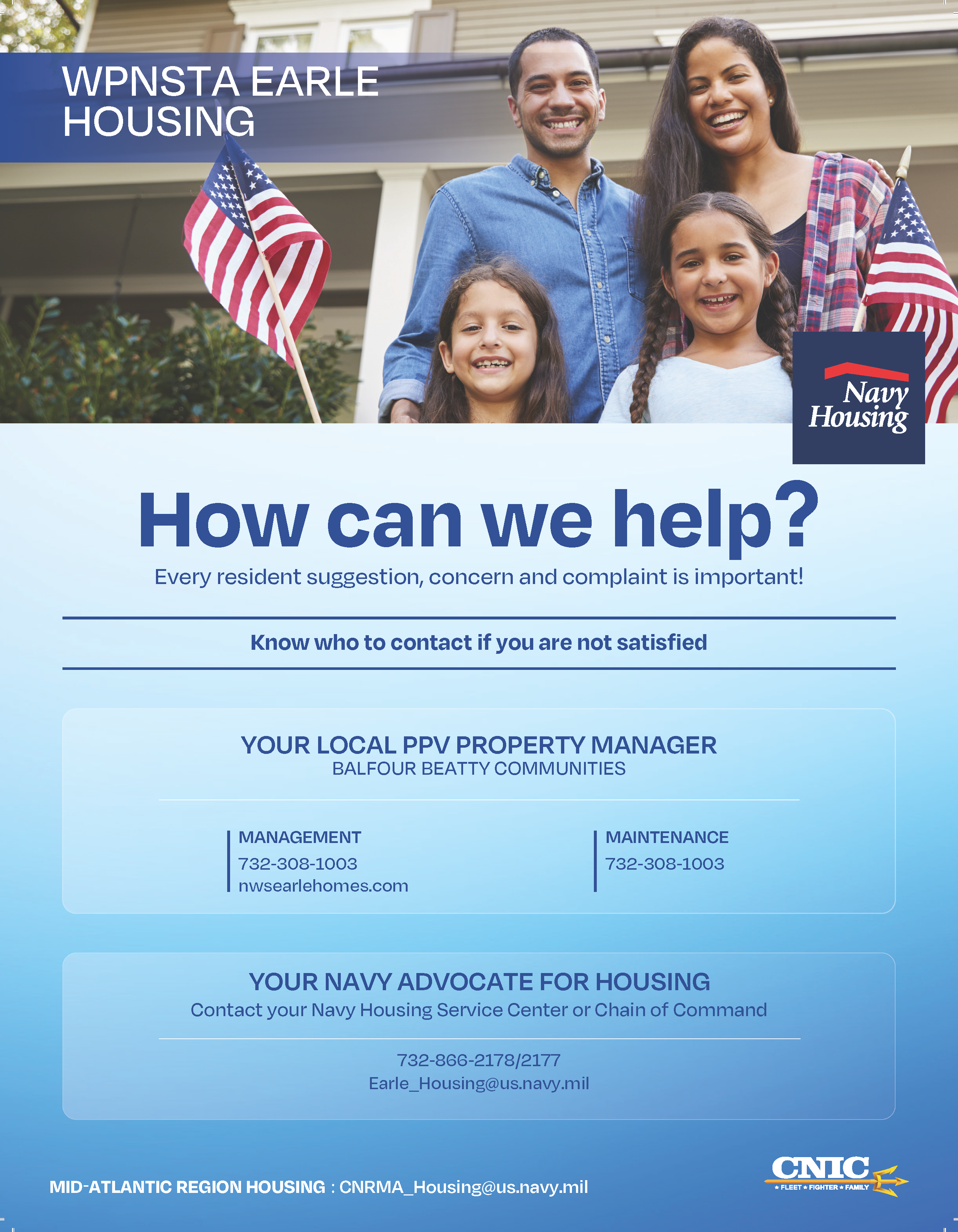 WPNSTA Earle has partnered with Balfour Beatty Communities to offer military families outstanding housing choices. Contact the HSC to get the most current projection of housing availability and wait list information.