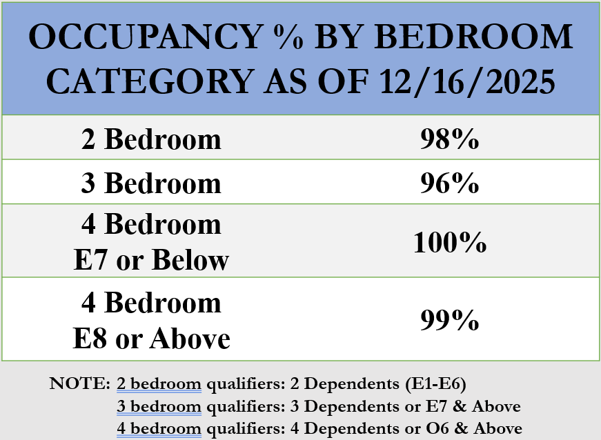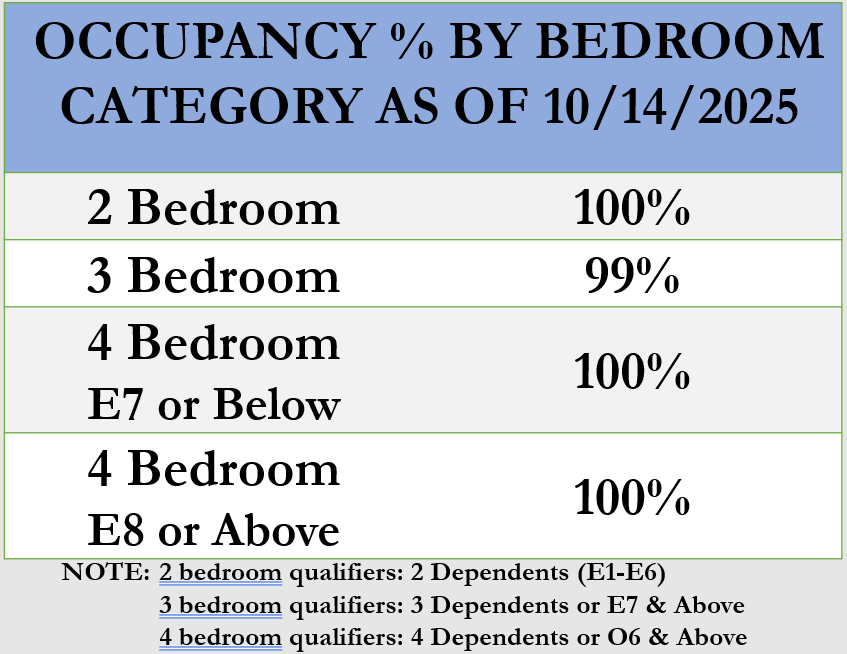 If appropriate quarters are not available upon arrival, personnel will be placed on a waiting list. When a unit becomes available, the Service Member and family will receive a government-funded move from their off-base residence to family housing on base. Contact the HSC to get the most current projection of housing availability and wait list information.